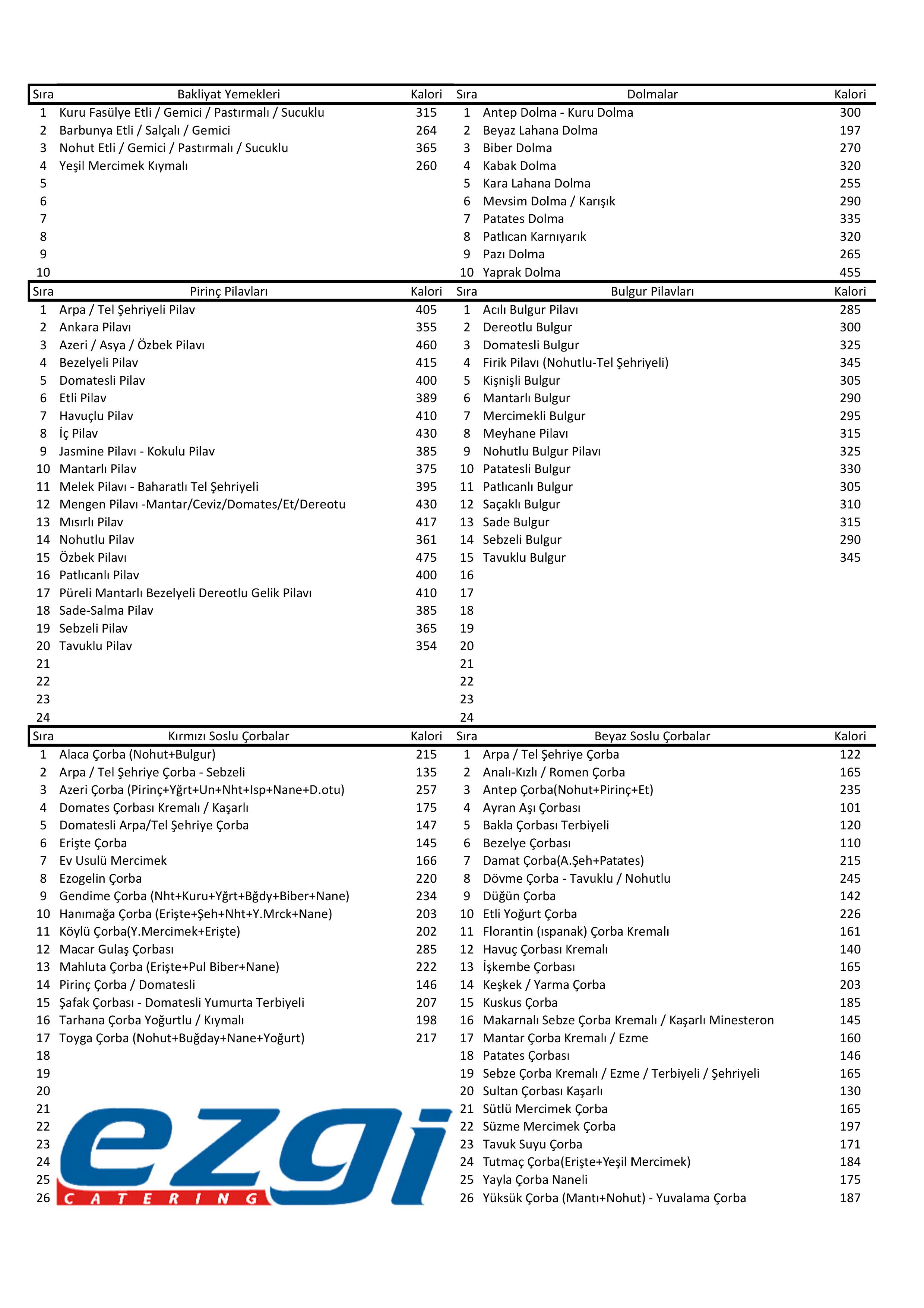 Sektörel Bilgiler, Kalori/Gramaj Tablolarımız
